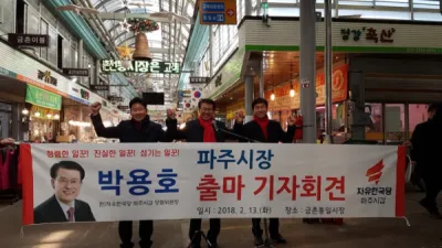 청렴하고 기업하기 좋은 파주를 만들겠다 자유한국당 박용호(54) 파주시 갑 당협 위원장이 2월 13일 금촌전통시장에서 파주시장 출마를 선언했다. 박위원장은 청렴하고 기업하기 좋은 도시 파주를 만들 적임자임을 강조하며 4차산업 혁명의 전진기지, 대한민국의 중추도시가...