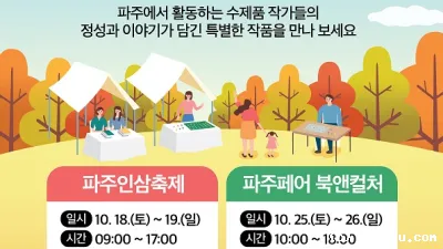 파주시, 10월 2주간 축제 속 작은 장터‘수제품 아트마켓’운영 파주시는 오는 18일부터 19일까지 이틀간 열리는 ‘파주인삼축제’와 오는 25일부터 26일까지 개최되는 ‘파주페어_북앤컬처...