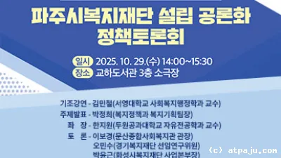 시민과 함께 만드는 복지정책의 새로운 출발 파주시는 오는 29일 14시, 교하도서관 3층 소극장에서 ‘파주시복지재단 설립 공론화 정책토론회’를 개최한다고 밝혔다. 이번 토론회는 파주시복지재단 설립을 앞두고 시민, 전문가, 현장 종...