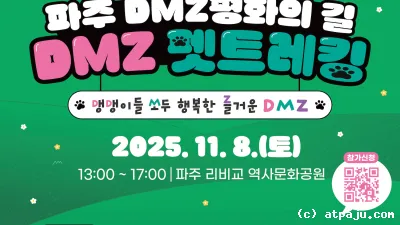 반려견과 함께 걷는 평화의 길 파주시와 파주도시관광공사(이하 공사)는 오는 11월 8일 토요일 리비교 역사문화공원과 DMZ 평화의 길 9코스에서 ‘2025 파주 DMZ평화의 길 DMZ펫트레킹’을 개최한다고 밝혔다. 이번 행사는 반...