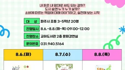 파주 교하도서관, 친환경 소비를 배우는 미파솔 공유학교 - 여름방학 초등생 대상 독서교실 겸해 8월 6~8일 사흘간 운영 파주시 교하도서관은 8월 6일부터 8일까지 미파솔 공유학교 ‘여름독서교실-소비와 지구&...