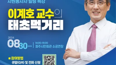 ‘알면 쓸모있는 봉사활동 잡학사전’ 특강 - 파주시자원봉사센터,「태초먹거리」저자 이계호 교수 특강 개최 - 8월 30일, 자원봉사 300여 명 대상 맞춤형 교육 파주시자원봉사센터는 오는 30일 파주...