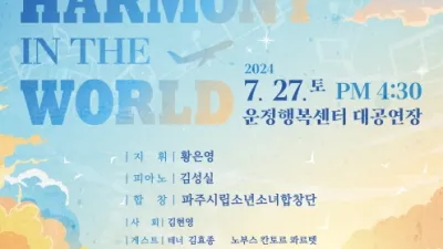 파주시 시립소년소녀합창단, 제3회 정기연주회 개최 파주시는 오는 27일 운정행복센터 대공연장에서 파주시립소년소녀합창단 제3회 정기연주회 ‘하모니 인 더 월드(Harmony in the world)’를 개최한다....
