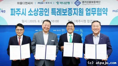 - 특별출연금 3억 원으로 30억 원 규모의 협약보증 지원…소상공인 금융부담 완화 파주시는 지난 21일 하율디앤씨㈜, 하나은행, 경기신용보증재단(이하 ‘경기신보’)과 함께 소상공인 특례보...