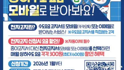파주시, 전자고지·자동납부 신청 시 수도요금 최대 600원 할인- 2026년 1월부터 제도 시행 파주시는 2026년 1월부터 수도요금 전자고지와 자동납부를 동시에 신청하는 시민에게 수도요금을 할...