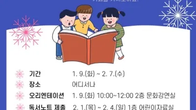 파주 교하도서관, ‘겨울아 읽자’ 운영 파주 교하도서관은 1월 9일부터 2월 7일까지 겨울 독서 교실 ‘겨울아 읽자!’를 운영한다. ‘겨울아 읽자!’는 초등학생 60명...