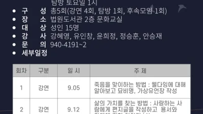 파주시 법원도서관, 18일부터‘길 위의 인문학’참여자 선착순 모집 - 20세 이상 성인 15명 대상 프로그램 진행…참가비 무료 파주시 법원도서관은 오는 18일부터 길 위의 인문학 프로그램 &lsqu...