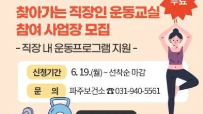파주보건소, 6월 19일부터 직장인 운동교실 참여 사업장 2곳 모집 파주보건소는 ‘찾아가는 직장인 운동교실’에 참여할 사업장 2곳을 6월 19일부터 선착순으로 모집한다. ‘찾...