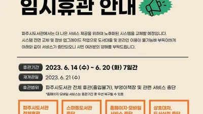 2023-06-13 01:47:116월 14일부터 20일까지 파주시 도서관 임시휴관…시스템 교체