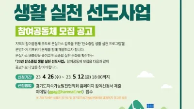 “생활 속 온실가스 배출 감축으로 기후위기 극복” 경기도, ‘탄소중립 생활실천 참여공동체’ 모집 ○ 「2023년도 탄소중립 생활 실천 선도사업」 참여공동체 모집 신청․접수 - (신청기간) 2023. 4...