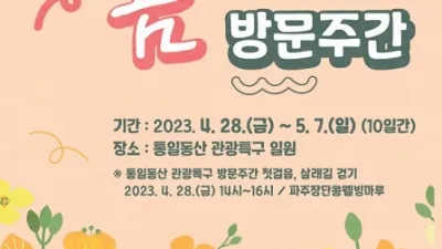 파주 통일동산 관광특구 봄 방문주간 운영…살래길 함께 걸어요 - 살래길 걷기 및 체험 행사, 4월 19일부터 24일까지 선착순 35명 모집 파주시는 4월 28일부터 5월 7일까지 통일동산 관광특구 일원에서 ...