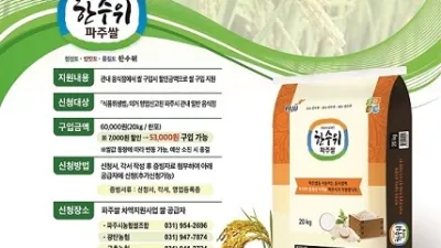 관내 일반음식점 대상, 파주쌀 구입 차액 지원…소비 촉진 기대 - 4월 20일부터 예산 소진 시까지 파주시는 4월 20일부터 ‘고품질 파주쌀 사용 음식점 차액 지원’ 사업을 실시한다. ...