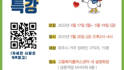 파주시, 장애인 취업성공특강 교육생 15명 모집- 5월 26일 취업성공특강 실시…고용 형태별 취업 전략 수립 파주시는 오는 17일부터 5월 19일까지 ‘2023년 장애인 취업성공특강’ 참여자 15명을 모집한다....