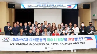 외국인 계절근로자 농가 대면식 개최…파주시 농촌 인력난‘단비’ 파주시는 4월 12일 농업기술센터에서 필리핀 제너럴 마리아노 알바레즈(GMA)시에서 입국하는 외국인 계절근로자를 환영하는 대면식을 가졌...
