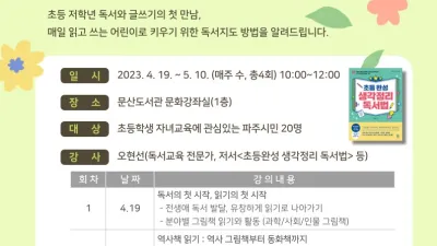 파주시 문산도서관, ‘2023년 부모독서교실’강좌 운영 - 독서 및 글쓰기 습관 형성 기대 파주시 문산도서관은 4월 19일부터 5월 10일까지 ‘2023년 부모독서교실’ 강좌를 운영한다. ...