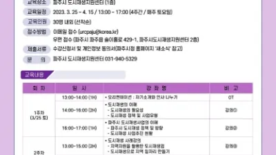 2023-03-09 08:27:08도시재생 역량 강화…파주시, 도시재생대학 기초과정 수강생 30명 모집