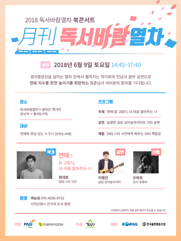 오는 6월 9일 열리는 이번 북콘서트에는 SNS 스타작가 최대호 시인을 초청해 ‘연애:참 고맙다, 내 마음 알아주는 너’라는 주제로 청년들과 만날 예정이다. 열차 안에서 ‘인생 최고의 순간’, ‘연애 기간 중요한 언어의 힘’ 이라는 키워드로 청년들과 이야기를 나눈 후 경의선 책거리로 이동해 SNS 백일장을 진행할 계획이다. 참여자들에게는 작가가 직접 쓴 캘리그라피 선물을 증정한다.