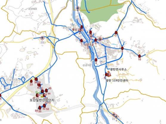 빅데이터 분석과 공간정보를 융합·활용해 소화전, 상수관로, 취약지역 등의 위치를 광탄·조리 지도에 표기해 보기 쉽고 한눈에 위치를 파악할 수 있도록 만든 것이다.