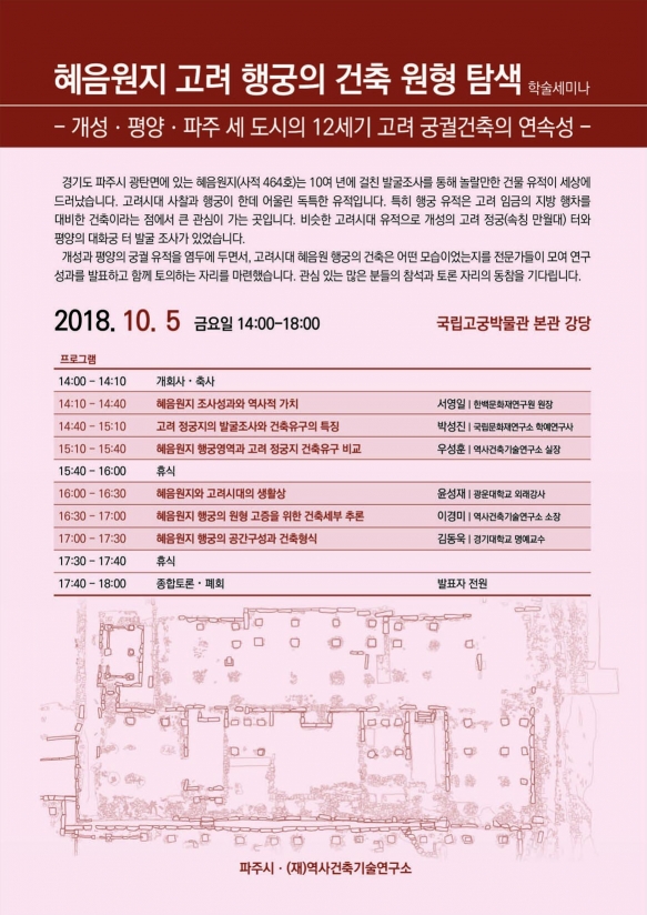 파주시는 10월 5일 오후 2시에 서울시 종로구 소재 국립고궁박물관 본관 강당에서 ‘혜음원지 고려 행궁의 건축 원형 탐색’을 주제로 학술세미나를 개최한다.