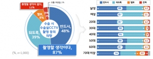 만일 수술을 받게 된다면 CCTV 촬영에 동의할 의향이 있느냐는 물음에는 48%가 반드시 동의, 39%가 되도록 동의하겠다고 답해 87%가 긍정적 반응을 보였다.