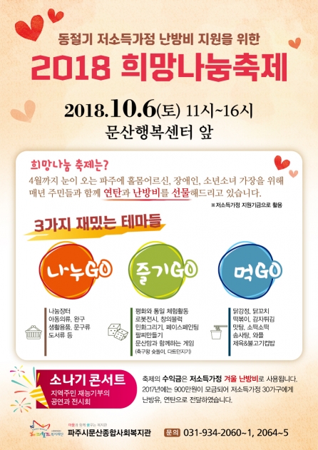 3월까지 눈이 내리는 파주시는 겨울이 되면 다른 지역에 비해 연탄이나 난방유 수요가 많은 지역이다. 파주시문산종합사회복지관에서 주관하는 희망나눔축제는 복지혜택을 받고 있음에도 혹한기로 따뜻한 겨울을 지내기 어려운 저소득 취약계층의 난방기금 마련을 위해 매년 개최되고 있다.