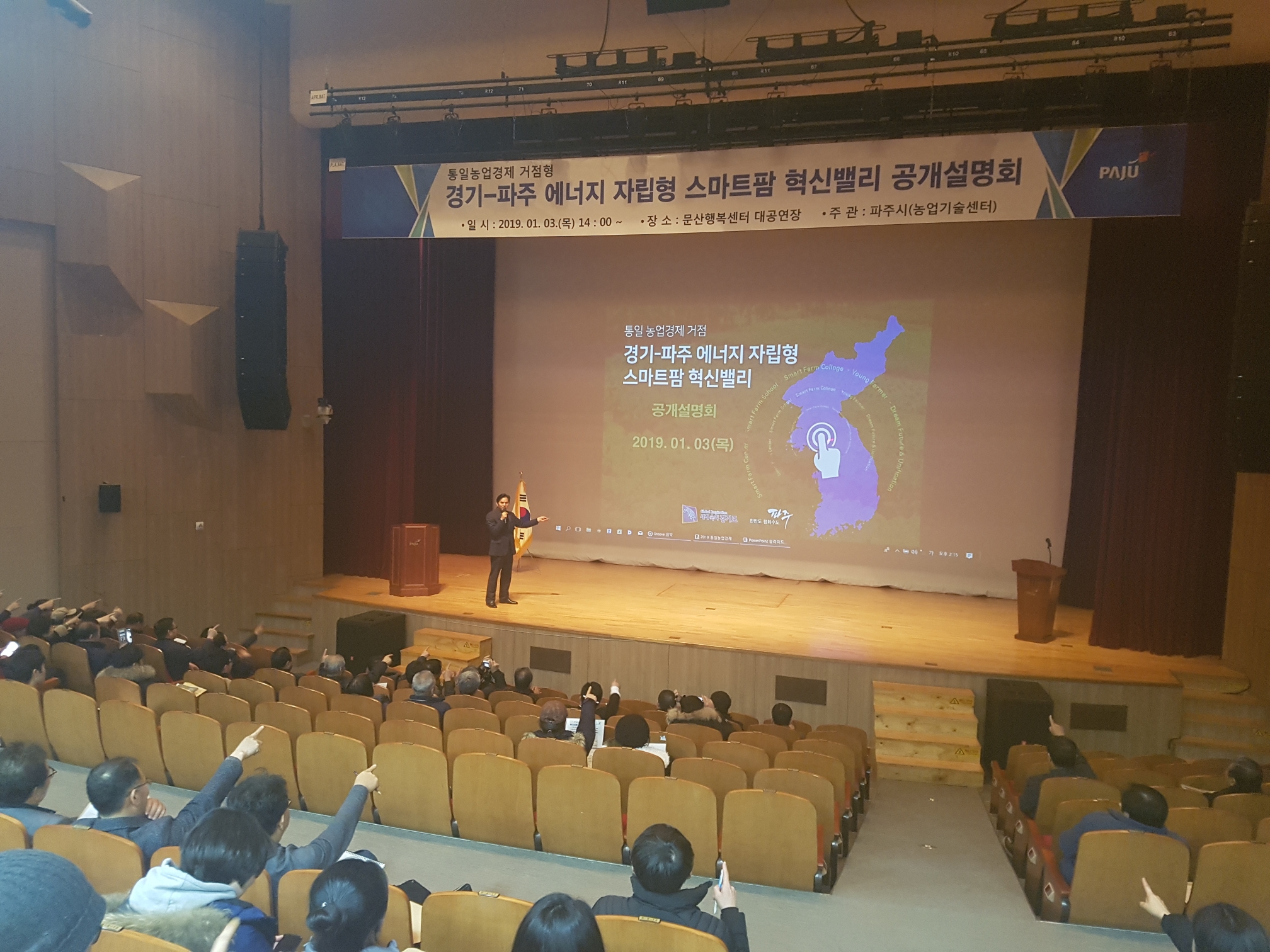 파주시는 지난 3일 문산행복센터 대강당에서 지역주민과 시설원예농가, 농민단체장, 스마트팜 기술 관련사업 업무 관계자 등 150여명이 참석한 가운데 ‘통일 농업경제 거점 경기-파주 에너지자립형 스마트팜 혁신밸리’ 조성사업에 대한 공개설명회를 개최했다.