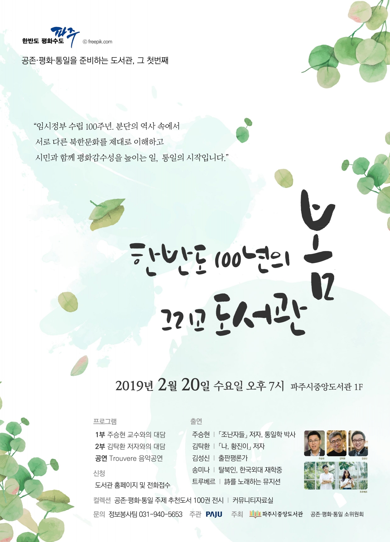 중앙도서관은 평화와 통일 관련 자료와 도서를 수집·전시하고 다양한 행사 등을 통해 시민들의 통일 감수성 함양에 적극적으로 나설 계획이다. 그 일환으로 ‘공존·평화·통일 소위원회’가 주관하는 ‘한반도 100년의 봄, 그리고 도서관’콘서트를 오는 20일 오후 7시 파주시중앙도서관에서 개최한다.