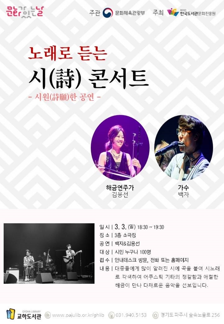 교하도서관‘노래로 듣는 시’콘서트 개최 ...공공도서관 문화가 있는 날 사업시행 도서관 선정