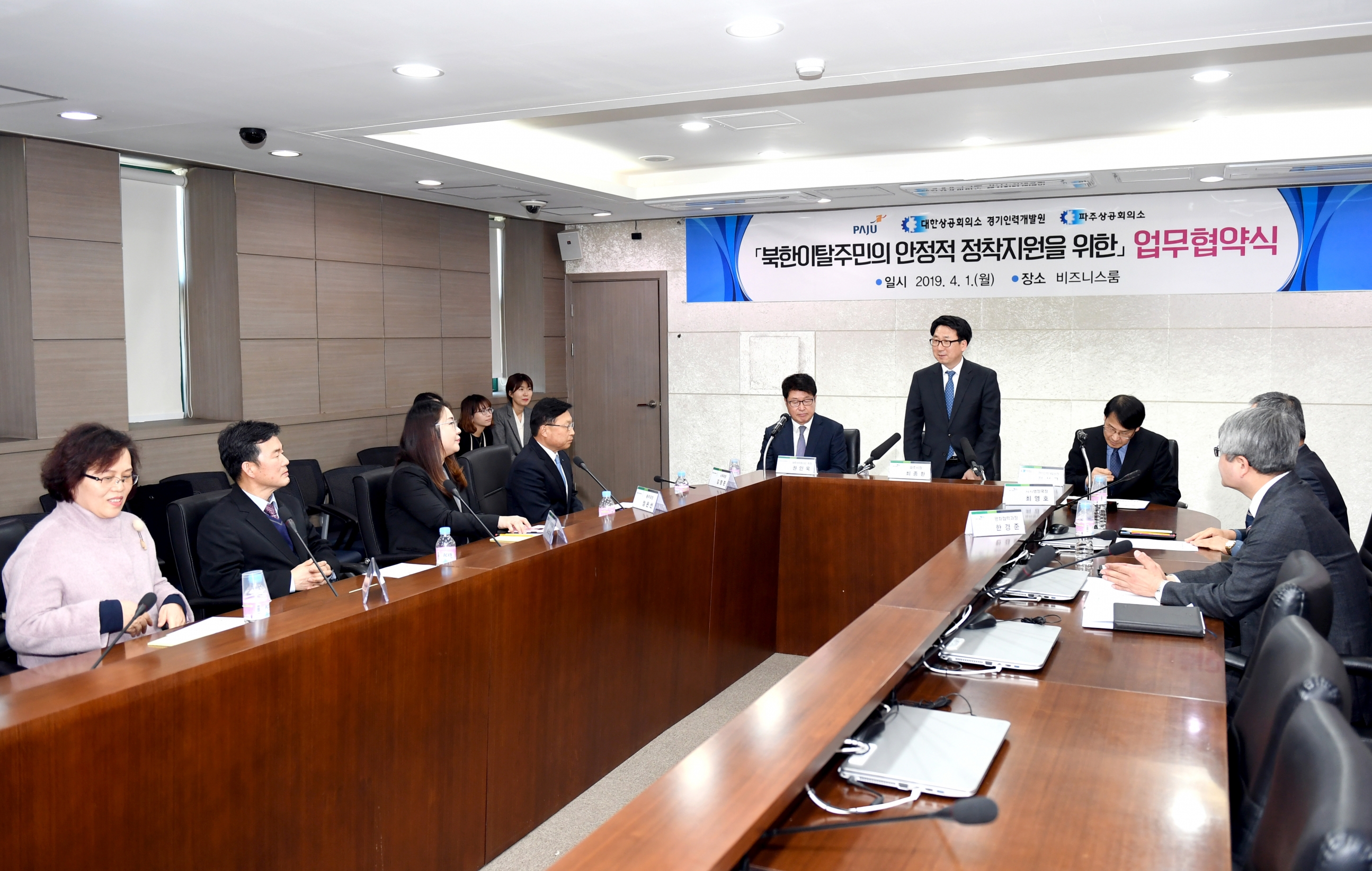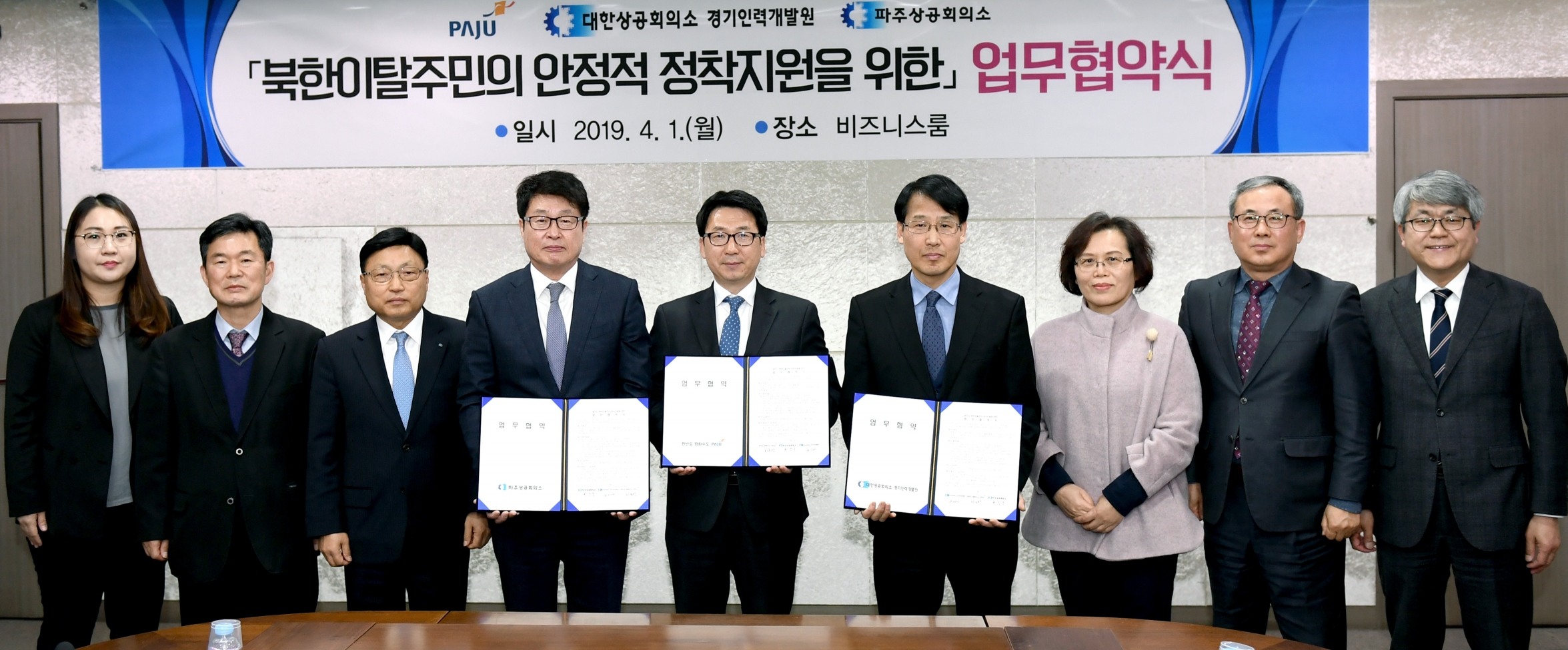 파주시는 1일 파주시청 비즈니스룸에서 대한상공회의소 경기인력개발원, 파주상공회의소와 북한이탈주민의 안정적인 정착을 위한 업무협약식을 가졌다.
