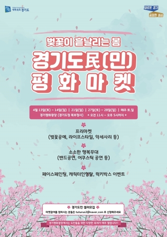 경기도는 오는 4월 13일을 시작으로 4월 한 달 간 경기도청 북부청사 앞 ‘경기평화광장’에서 ‘벚꽃이 흩날리는 봄, 경기도民 평화마켓’을 개최한다고 10일 밝혔다.
