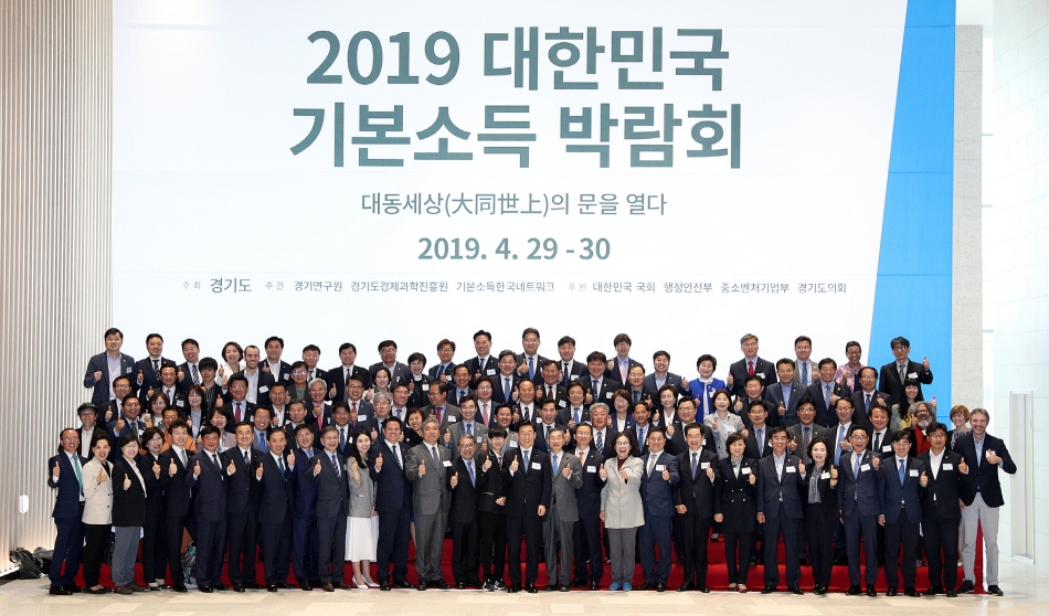 이재명 경기도지사와 도내 30개 시․군 자치단체장, 백두현 경남 고성군수, 박정현 충남 부여군수, 정토진 전북 고창 부군수 등은 29일 수원컨벤션센터에서 열린 ‘2019 대한민국 기본소득 박람회’ 개막식에서 협의회 출범을 위한 공동선언을 했다.