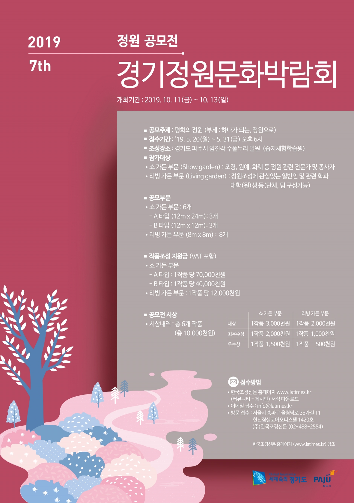 경기도와 파주시가 공동 주최·주관하는 2019 제7회 경기정원문화박람회에 조성될 ‘정원 공모전’이 20일부터 31일까지 진행된다.