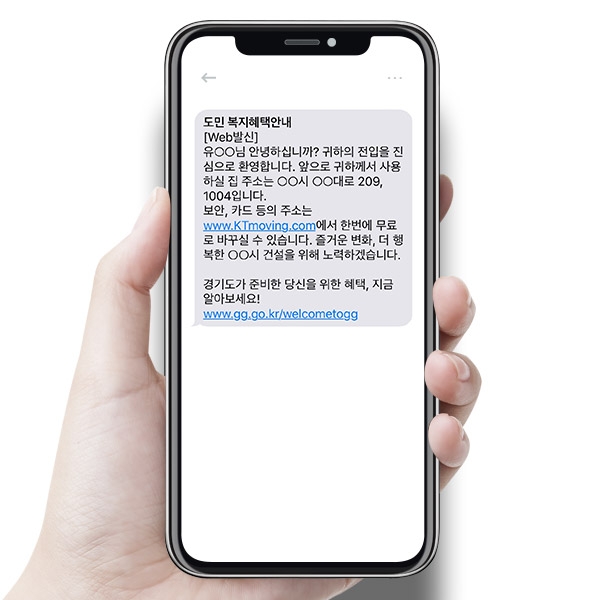 이런 가운데 도는 각 시군에서 전입자 대상 문자안내 서비스가 있다는 사실을 확인했다. 각 시군에서는 주민센터에 전입신고를 하는 도민이 동의할 경우 KT의 지원을 받아 전입지 도로명 주소를 문자메시지로 알려준다. 경기도는 이 문자 서비스에 경기도 홈페이지 복지혜택 안내서비스 주소(https://www.gg.go.kr/welcometogg)를 포함해 달라고 협조를 구했다. 문자서비스를 제공하지 않는 남양주와 안산시를 제외한 도내 29개 시‧군이 여기에 동의했고 지난 6월부터 별도 추가 비용없이 안내문자가 발송되고 있다.