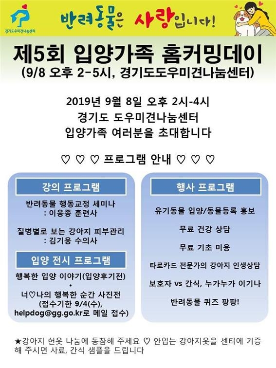 경기도 도우미견나눔센터는 오는 9월 8일 오후 2시부터 유기견 입양 가족 등 반려가족과 반려견을 초청해 ‘제5회 반려견 입양가족 홈커밍데이’ 행사를 개최한다.