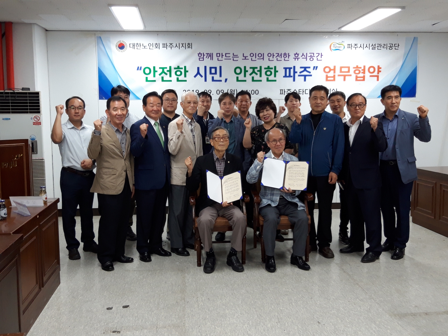 파주시시설관리공단은 9일 대한노인회 파주시지회와 상호협력하여 파주시의 지속가능 발전 및 사회공헌 실현을 위한 ‘안전한 시민, 안전한 파주’ 업무협약(MOU)를 체결했다.