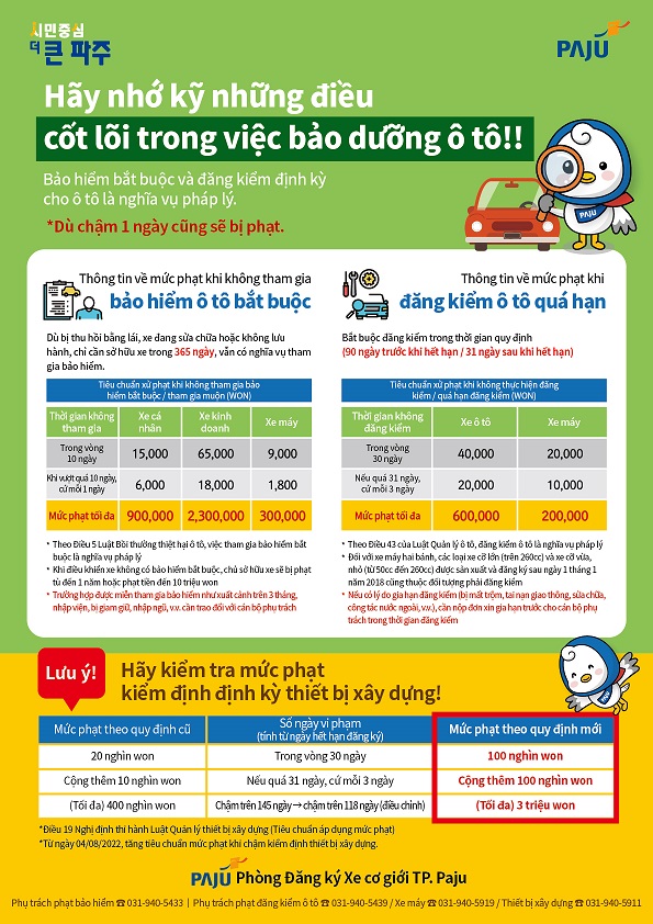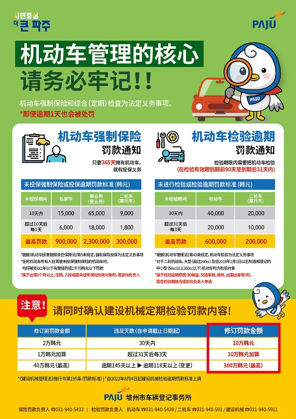 파주시는 최근 외국인 주민 증가에 따라 언어 장벽으로 인한 자동차 검사 및 의무보험 미가입으로 과태료를 부과 받는 사례가 늘고 있는 점을 반영해, 영어·중국어·베트남어 3개 국어로 번역된 안내문을 제공하기로 했다.