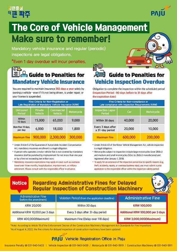 파주시가 관내 외국인 주민을 대상으로 자동차 검사와 의무보험 가입에 대한 다국어 안내문을 제작해 8월부터 배포한다.