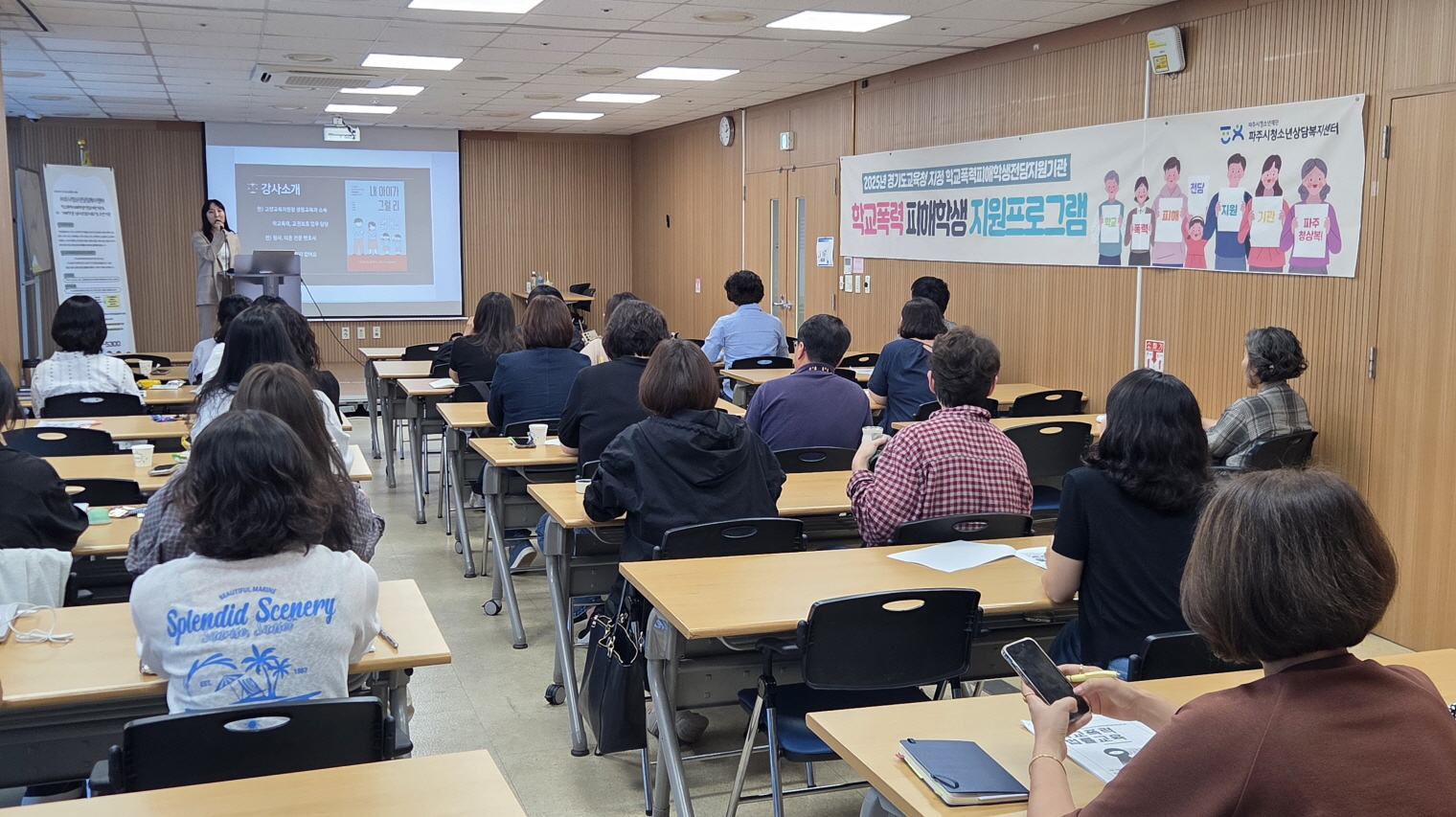 (재)파주시청소년재단 파주시청소년상담복지센터(센터장 장문희)는 학교폭력피해학생전담지원기관으로서, 지난 9월 27일(토) 오후 2시 백리향(와석순환로415, 복지동 6층)에서 「학교폭력 법률교육: 학생 보호를 위한 학교폭력 법률 바로알기」를 진행했다. 이번 교육에는 관내 학부모, 교사, 청소년지도자, 전문상담인력 등 50여 명이 참가해 높은 관심을 보였다.