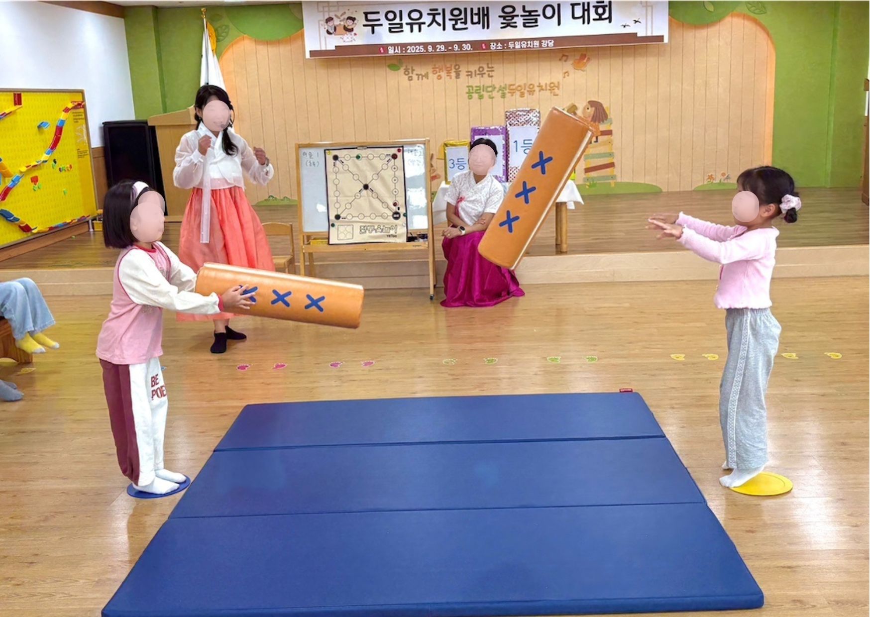 이어 9월 29일(월)과 30일(화) 양일간은 ‘제4회 두일유치원배 윷놀이대회’가 열렸다. 전 유아가 참여한 이번 대회는 예선과 준결승을 거쳐 결승전으로 진행되었으며, 최종 우승 학급에는 트로피와 상장이 수여되었다. 유아들은 규칙을 익히고 친구와 협력하며, 함께하는 놀이의 즐거움을 경험하였다.