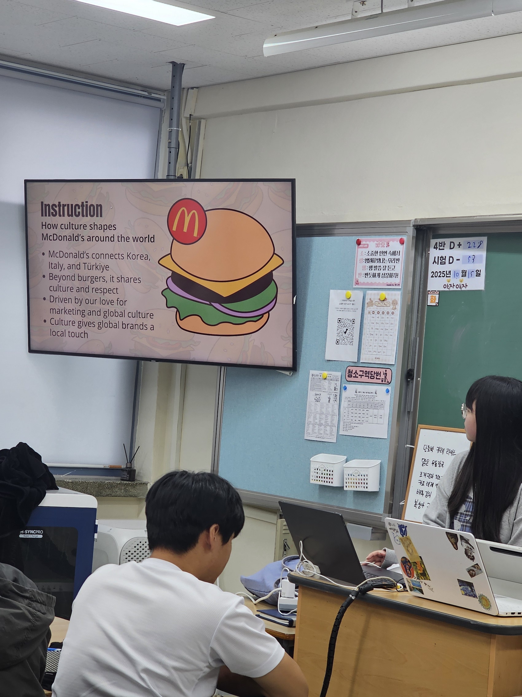 이번 주 동안 문산고에서는 전교생이 참여하는 한‧이탈리아‧튀르키예 합동수업이 진행된다. 1학년 학생들은 영어 수업 시간에 ‘한국과 이탈리아·튀르키예의 문화 비교’를 주제로 조별 발표를 펼치며, 음식·예절·학교생활·가족문화 등 다양한 주제 아래 문화적 공통점과 차이점을 영어로 소개한다. 해외 학생들은 한국 학생들의 발표를 들으며 자국의 문화를 비교하고, 서로의 공통점과 차이를 발견하는 과정에서 다문화 감수성을 키운다. 또한 수업에는 학생들이 통역 도우미로 자원하여 통역 앱등을 적극 활용, 원활한 의사소통을 돕고 있다.