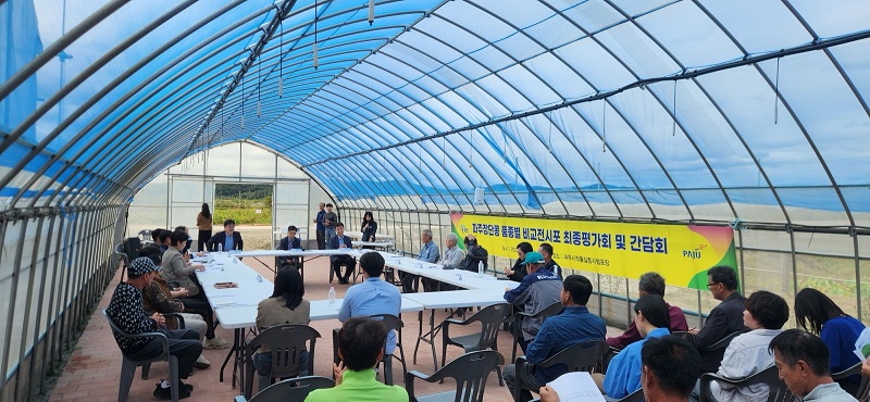 비교 전시포에는 농촌진흥청에서 육종한 강한·선풍·선한 3품종과 경기도농업기술원에서 육종한 강풍·선강 2품종을 재배하여 현장에서 품종별 생육 특성 등을 확인하고 의견을 나눴다.