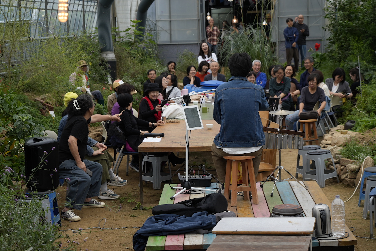 이윽고 온실의 색동평상 위에서 펼쳐진 공연은 참가자들이 온실과 밭에 자유롭게 앉아서 멀리 파평산 자락이 병풍처럼 에워싸고 있는 퍼머컬처 밭을 바라보며 즐길 수 있었다. 특히 청소년들이 하늘과 산과 밭을 배경삼아 아름다운 동작으로 발레를 했을 때 열렬한 환호와 격려의 박수가 쏟아졌다. 김마스터와 김태범, 손현숙님도 편안한 마음으로 특별한 무대에서 자신만의 노래와 연주를 멋지게 들려주었다. 예전에 이날치밴드와 독일의 유주베커가 여기서 풀들을 위한 공연을 한 적이 있었는데, 올해 평화마을짓자 밭에 사는 모든 생명과 사람이 함께 노래와 연주를 들으며 평화의 춤을 추니 대동세상이 바로 이런 게 아닐까하는 생각이 들었다.
