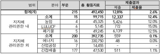 분야별로 보면 농업·폐기물 등 일부 부문은 평균 12% 내외의 제출률을 보였으나, 에너지(0.0%), 산업공정(미제출), 간접배출(1.1%) 등 주요 배출 분야는 거의 제출되지 않았다.