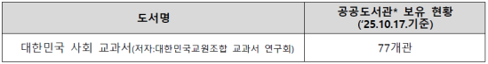 국회 문화체육관광위원회 박수현 의원(더불어민주당 / 충남 공주·부여·청양)이 22일 국립중앙도서관으로부터 제출받은 자료에 따르면, 식민사관과 독재 미화를 노골적으로 드러내는 도서 「대한민국 사회 교과서」를 전국 79개 공공도서관이 소장하고 있는 것으로 확인됐다.