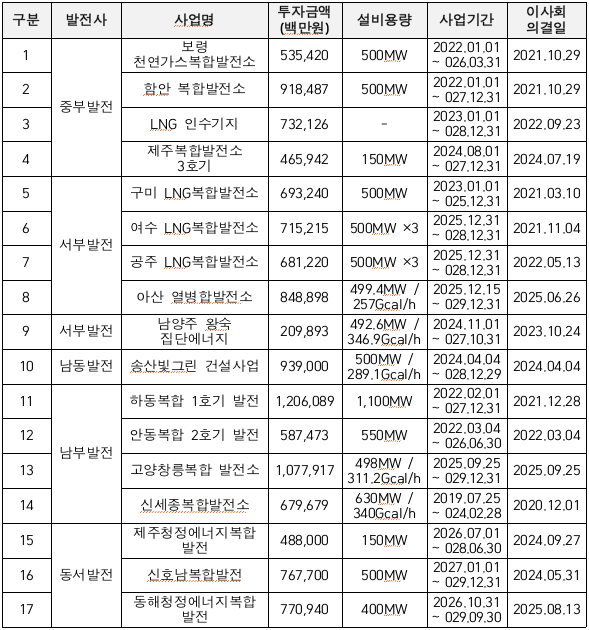 [표1] 발전5사 신규 LNG 설비 투자 현황