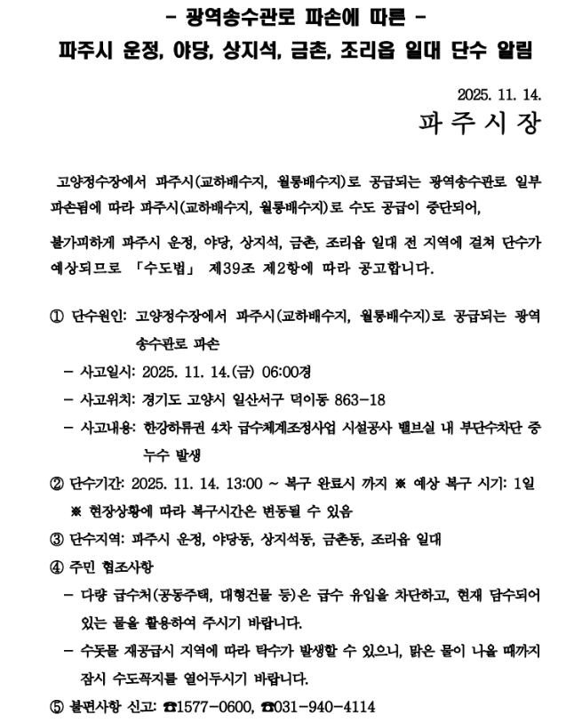 수도권 광역상수도 공사 사고(고양시 덕이동 지역에서)로 오늘 오후 1시부터 운정동, 야당동, 상지석동, 금촌동, 조리읍 일대에 단수 조치가 있다.