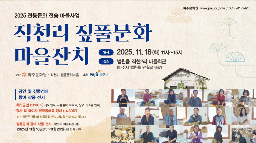 한편, 2025 전통문화 전승마을 지원사업은 파주시가 후원하고, 파주문화원과 직천리 짚풀문화마을이 공동 주관하여 진행한다.