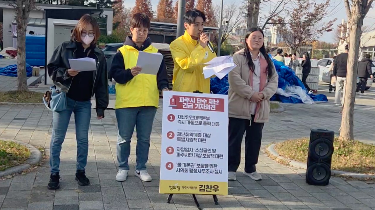 정의당 파주시위원회 김찬우 위원장과 운영위원회는 지난 11월 14일 파주시 전역 17만 가구에 발생한 대규모 단수 사태와 관련해, 파주시와 한국수자원공사의 무책임한 초기 대응을 강하게 규탄하며 재난 대응 체계의 근본적 쇄신을 촉구하는 입장을 밝혔다. 이번 단수는 한강 하류권 4차 급수체계 조정사업 과정에서 광역상수관이 파손되면서 발생했으며, 단 하루 동안 수도 공급이 중단됐음에도 시민 피해는 매우 컸다고 위원장은 설명했다.