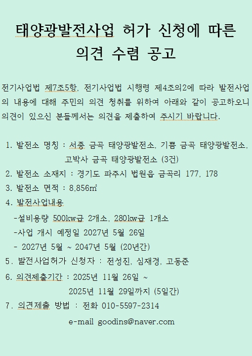 태양광 발전사업 허가 신청에 따른 의견 수렴 공고