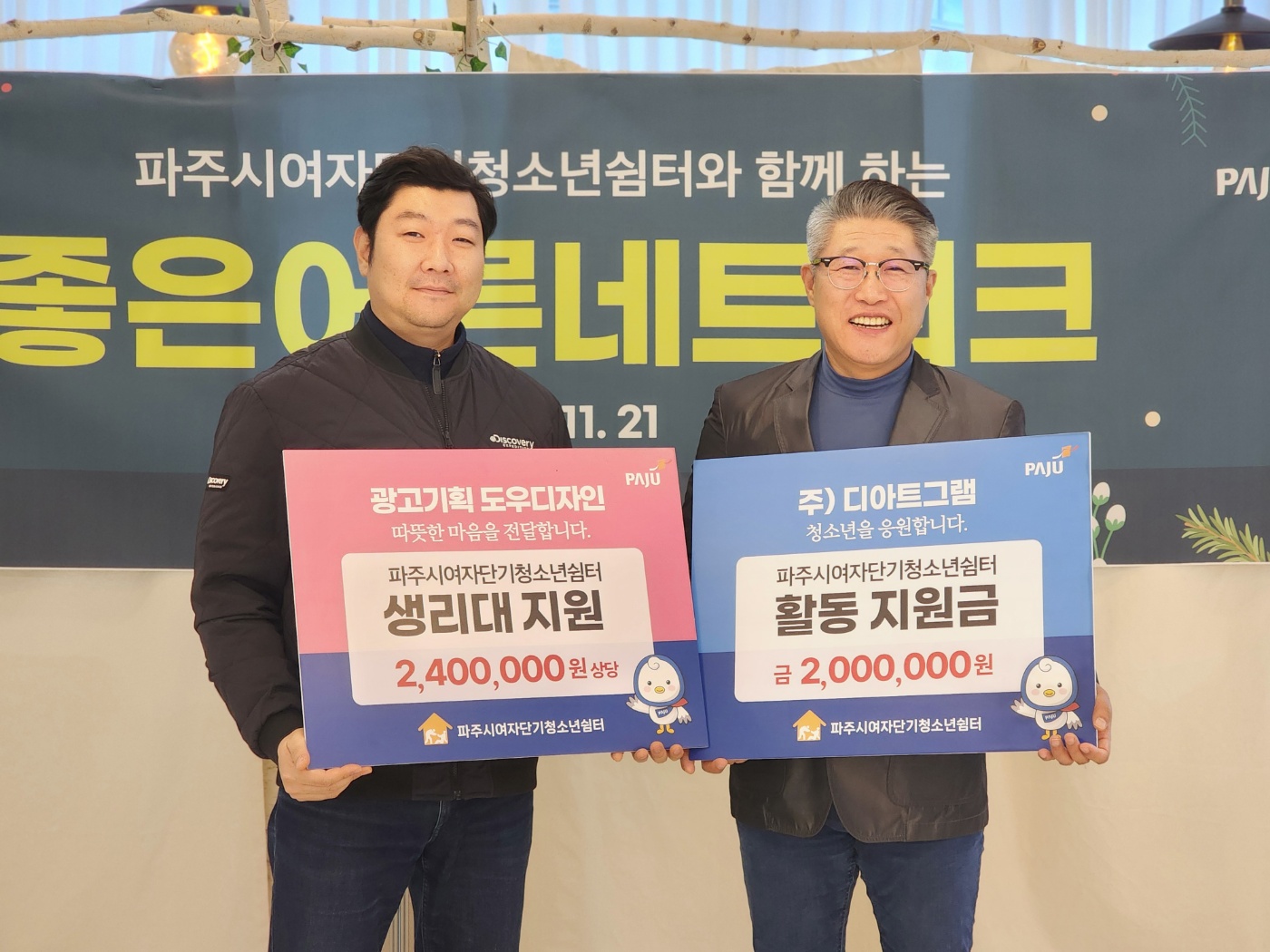 ㈜디아트그램(대표 남도우)과 도우디자인(대표 조은혜)이 파주시여자단기청소년쉼터(이하 쉼터)에 총 440만 원 상당의 물품 및 후원금을 기부하며 파주의 위기청소년 지원에 앞장섰다.